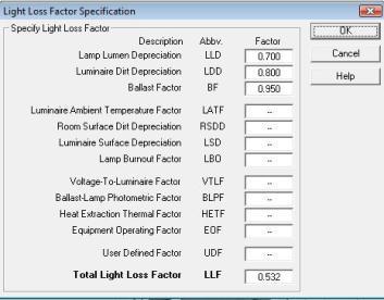 note: 0.0929030436 = 1 Lux to be exact.Light Loss Factor or also known as LLF in short form is one of the hardest parts to remember in the lighting industry. Each fixture can have a different value and some are better designed to eliminate some of the common losses we encounter when doing a lighting design. Each manufaturer of fixture, or lamp would have it's own value to be totally accurate.